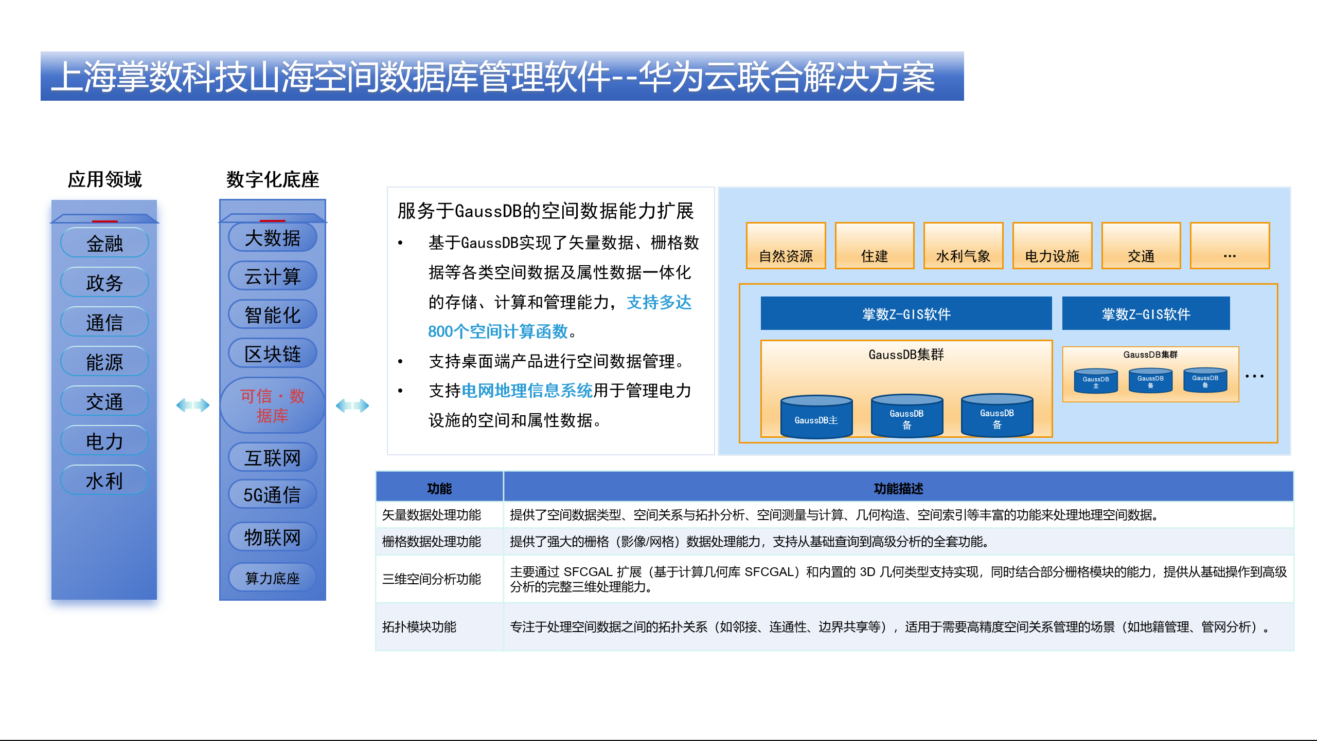 掌数山海空间数据库软件(Z-GIS)是GaussDB数据库核心空间扩展,完全兼容Postgis。它支持集中式,分布式,轻量化,HCS等多种形态GaussDB,赋予GaussDB数据库存储、管理及分析地理信息的能力,将数据库转变为强大的地理信息引擎。与传统GIS软件不同,Z-GIS将空间数据与属性数据无缝集成在同一数据库中,支持完整的SQL操作和ACID事务,确保了数据的完整性与一致性。其卓越性能的核心在于高效的空间索引与GaussDB先进的查询优化器,能够对海量空间数据执行极速的空间检索和复杂的空间计算。通过将空间计算能力深度集成至数据库内核,Z-GIS为处理大规模、高并发的空间数据挑战提供了企业级的稳健解决方案,成为构建现代空间信息系统的基石。
